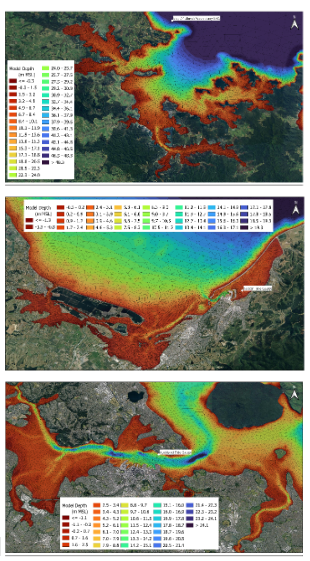 The model domain is defined by the horizontal grid shown in Figure 2 above. The computational mesh extends approximately 100–150 km offshore from the New Zealand coastline and penetrates into all tidal harbours and inlets. Mesh resolution varies from approximately 6 km at the open ocean boundary to 30–50 m along the coastline and within narrow channels and upstream areas (see nearshore examples on Figure 3). The model has been validated against tidal and wave observations from sites around New Zealand.