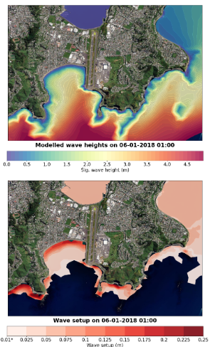 Figure 4: Example of modelled significant wave heights and wave setup at Lyall Bay in Wellington.
